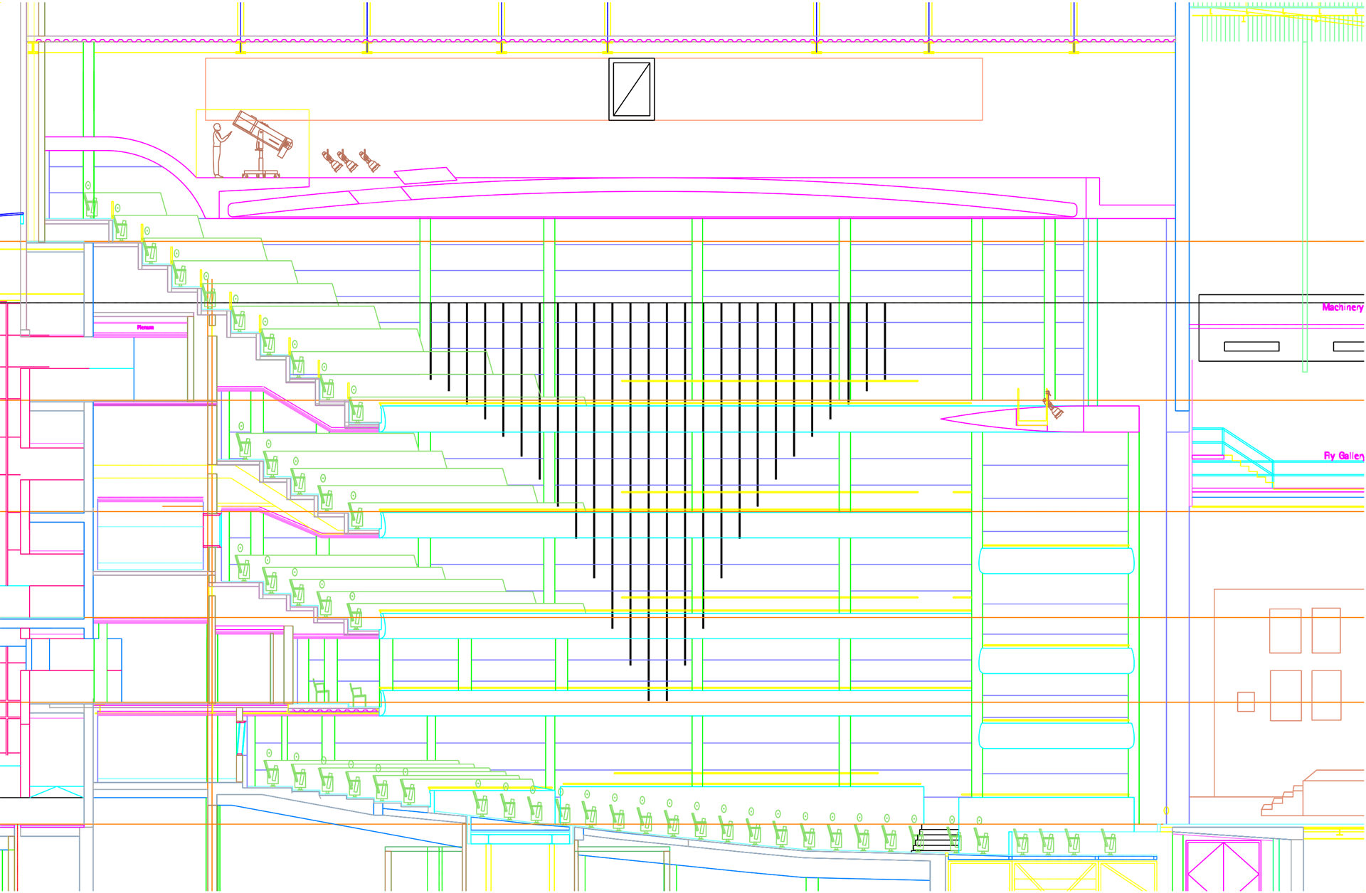 Eventually we settled on the rounded parabola shape because it seemed more natural, more random and organic. Then we tried a parabola formed of parabolas, and a parabola with a rounded top. We settled on the parabola shape. We then had to figure out how many strands would be necessary to express this shape and what lengths they would be. We knew we wanted a huge chandelier, one that would block people’s view of the stage, so the chandelier had to be retractable.