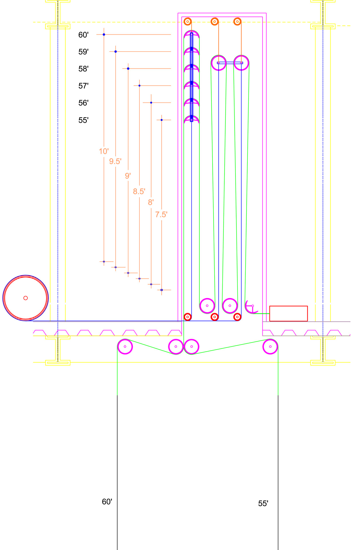 Clancy put together a team with Robert Degenkolb as the project manager. We began to realize that fibre optic would have its limitations, namely the light could only travel about 40’ and the glass fibre required a large radius on the sheaves, blocks and hoists; so, we decided to go with an LED at the end of an acrylic rod. The LED head was so strong that no graduated frit or pattern on the pure, cast acrylic rods were necessary to make them glow evenly.